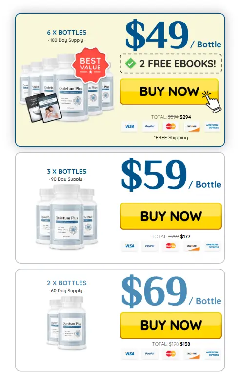 It’s simple! You can place your order directly through the official Quietum Plus website linked in this review. You’ll also get access to exclusive discounts, free bonuses, and free shipping depending on the package you choose.