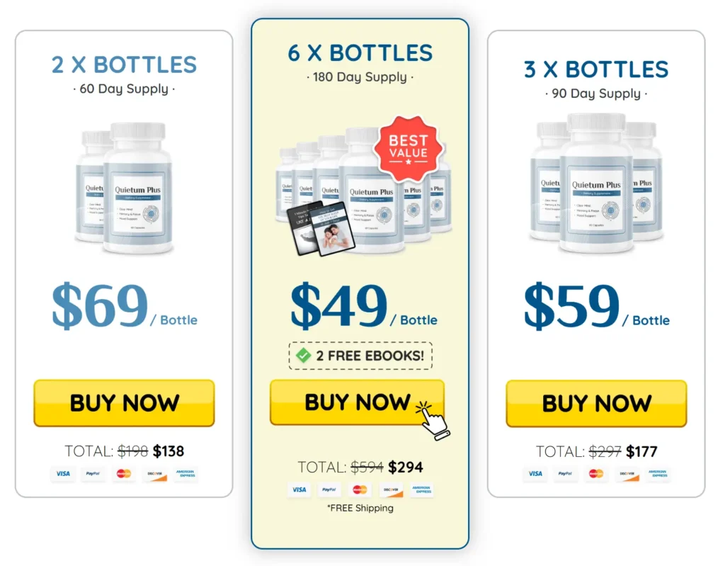 For the best results and continuous support, we recommend ordering at least 3 to 6 bottles of Quietum Plus. This allows your body the time it needs to fully benefit from the formula — and helps you save more with the best value bundles. These offers may be limited, so it’s a good idea to take advantage while they’re available.